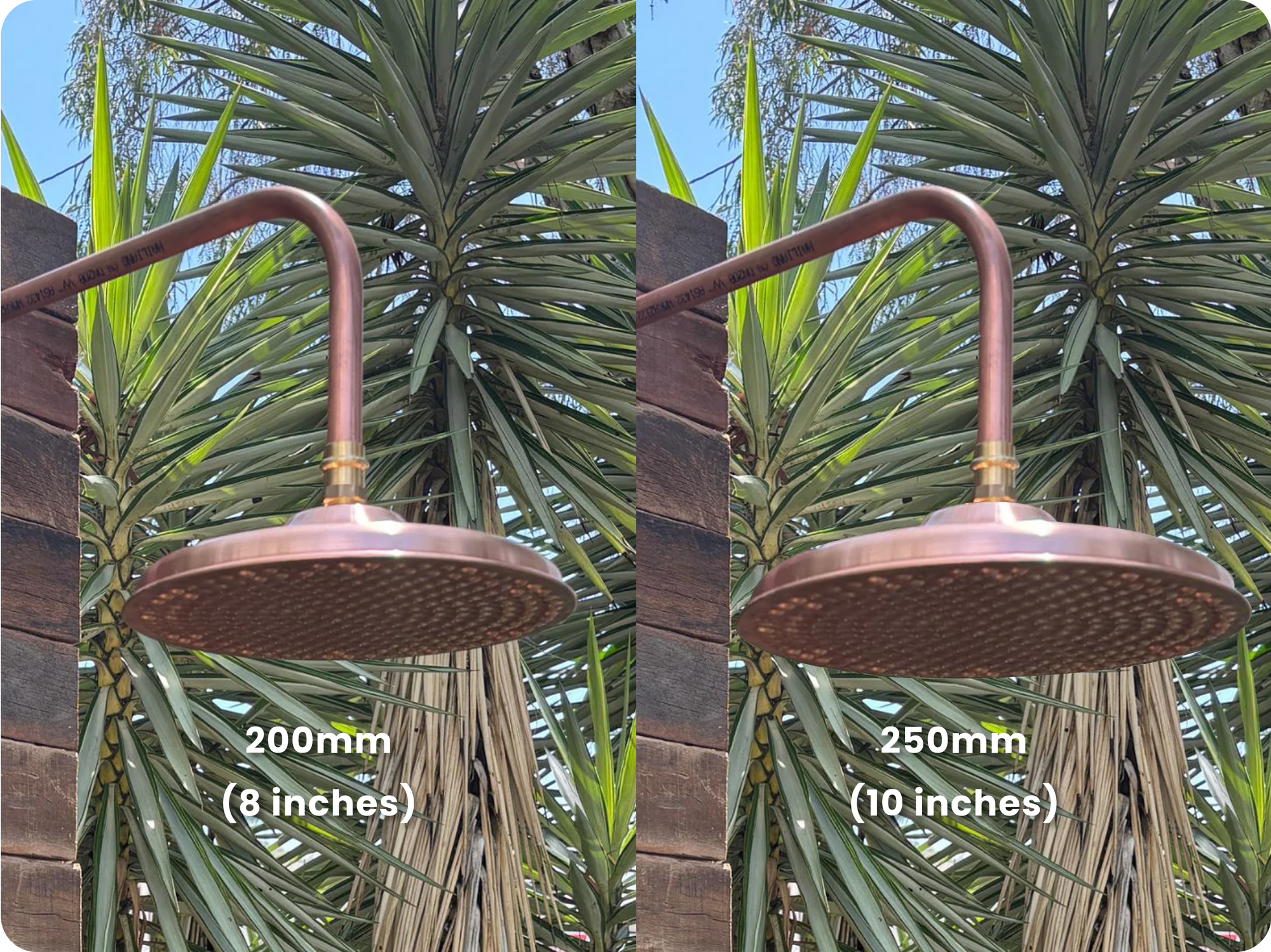 This shower kit - the Burleigh Outdoor Shower Kit - 200mm Copper Head has a 200mm or 8” Copper Shower rose. If you want a larger 250 mm shower head look at the Burleigh Outdoor Shower Kit - 250mm Copper Head listing.