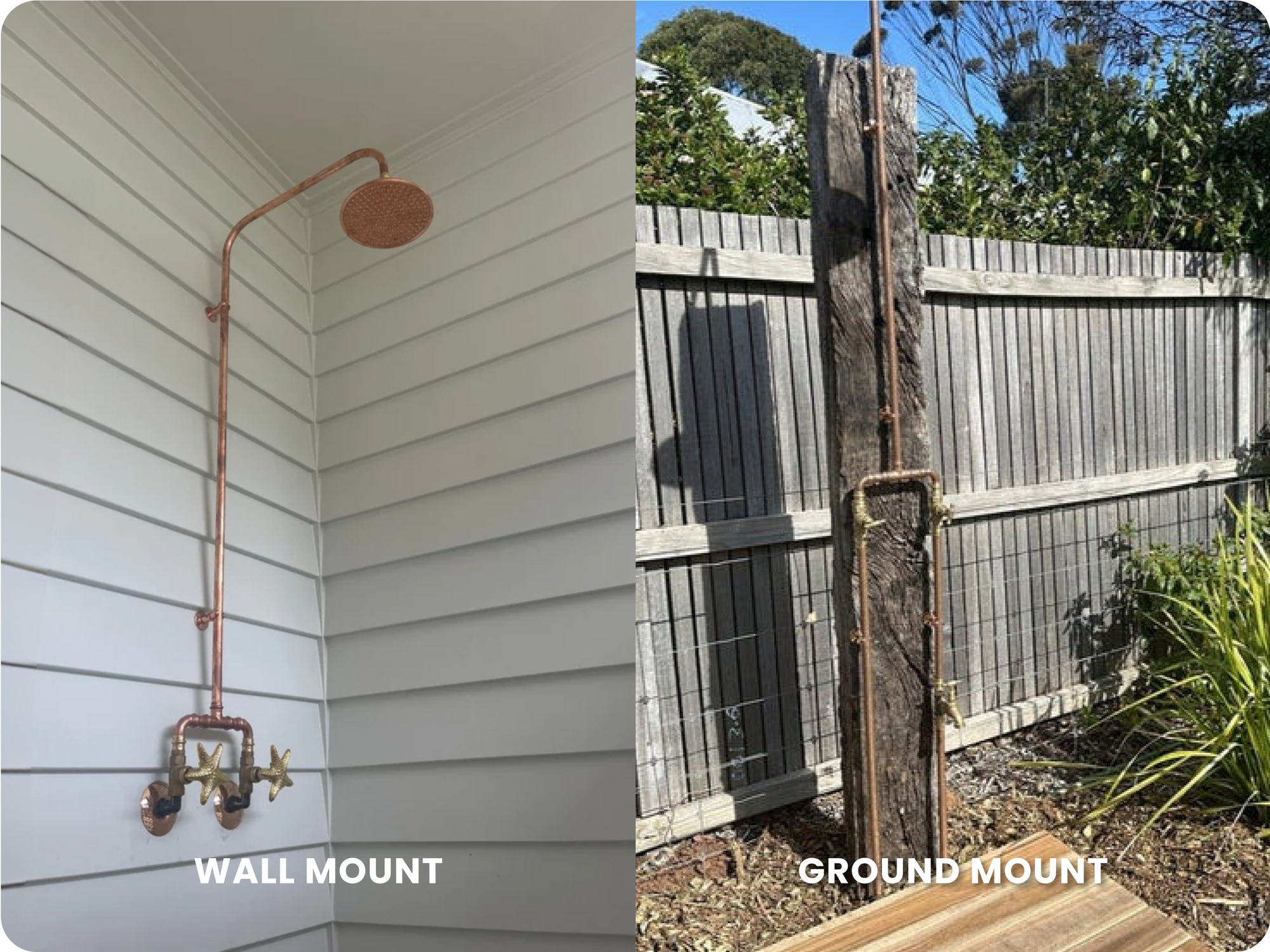 Will the water feed pipes come up from your feet (Ground mount), come into the shower at waist height (Wall mount), or come out & down from the wall at head height (Head mount). This shower kit only has Ground or Wall mount options. See the Head Mount Outdoor Shower kit if you need that.)