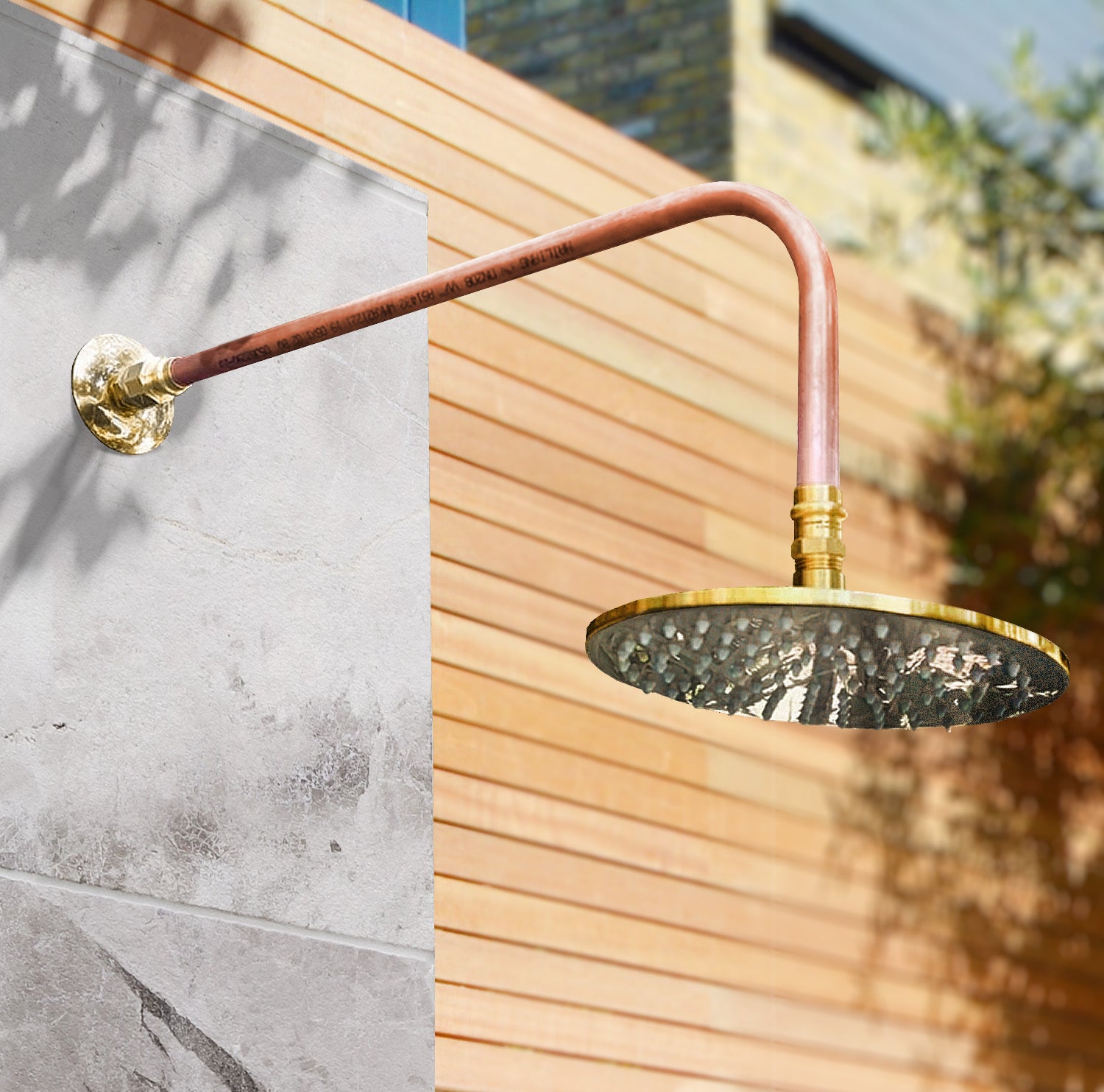 1. The all-copper Burleigh Outdoor Shower has copper shower head, copper pipes and polished cast copper wall clips for the all-copper look.
