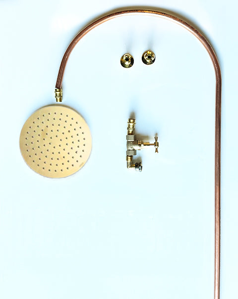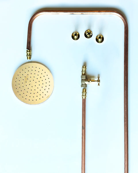 - The copper and brass accented Kirra Outdoor Shower has a brass shower head, copper pipes and polished cast brass wall clips.