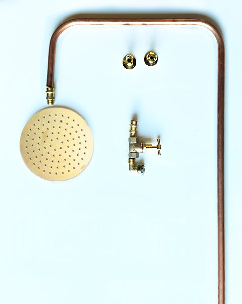 The Kirra Copper Wall Mounted Shower comes with a brass shower head and brass clips to attach the pipe. The Burleigh has a genuine copper shower head made in Australia and copper coloured pipe clips.