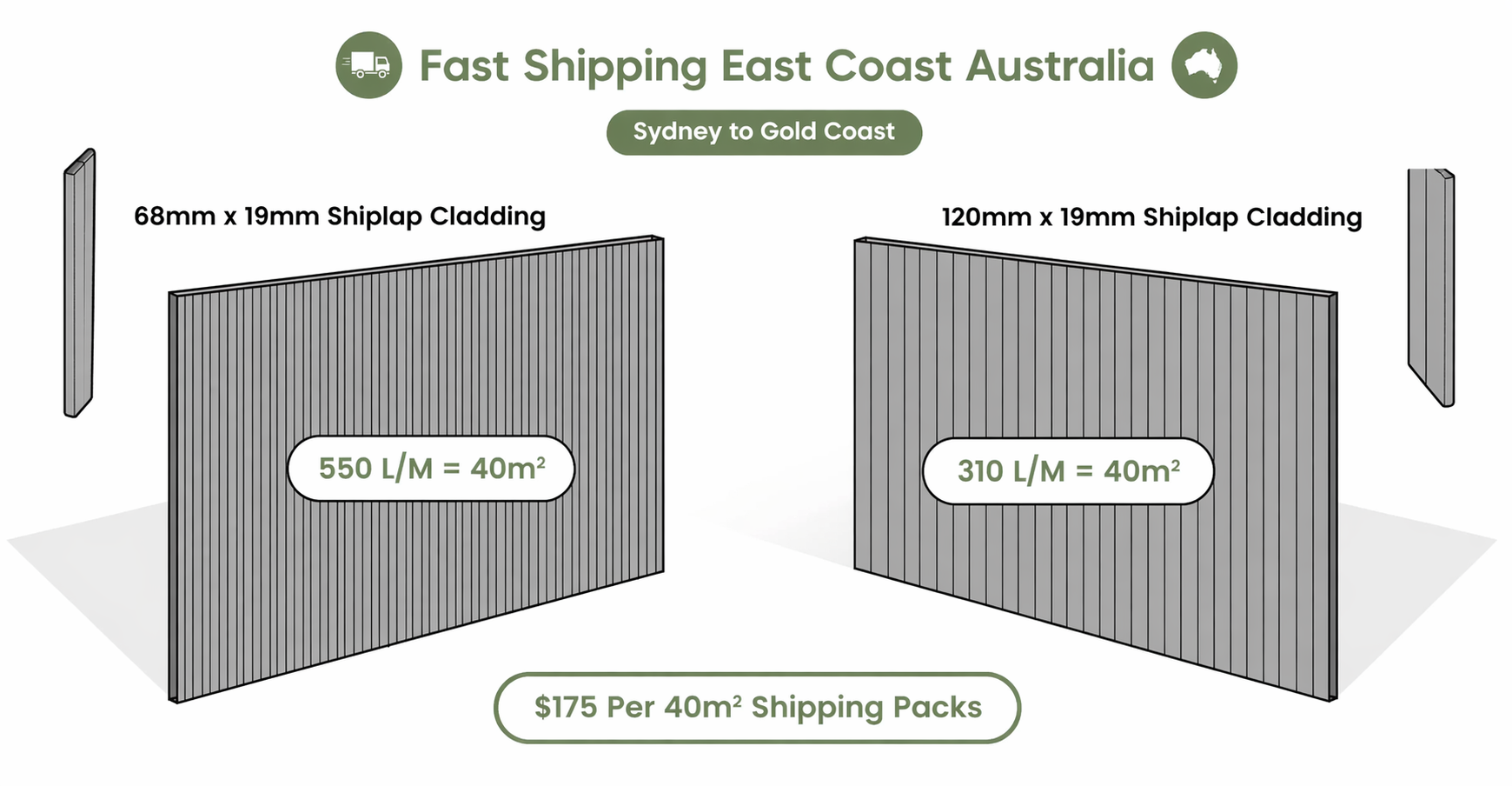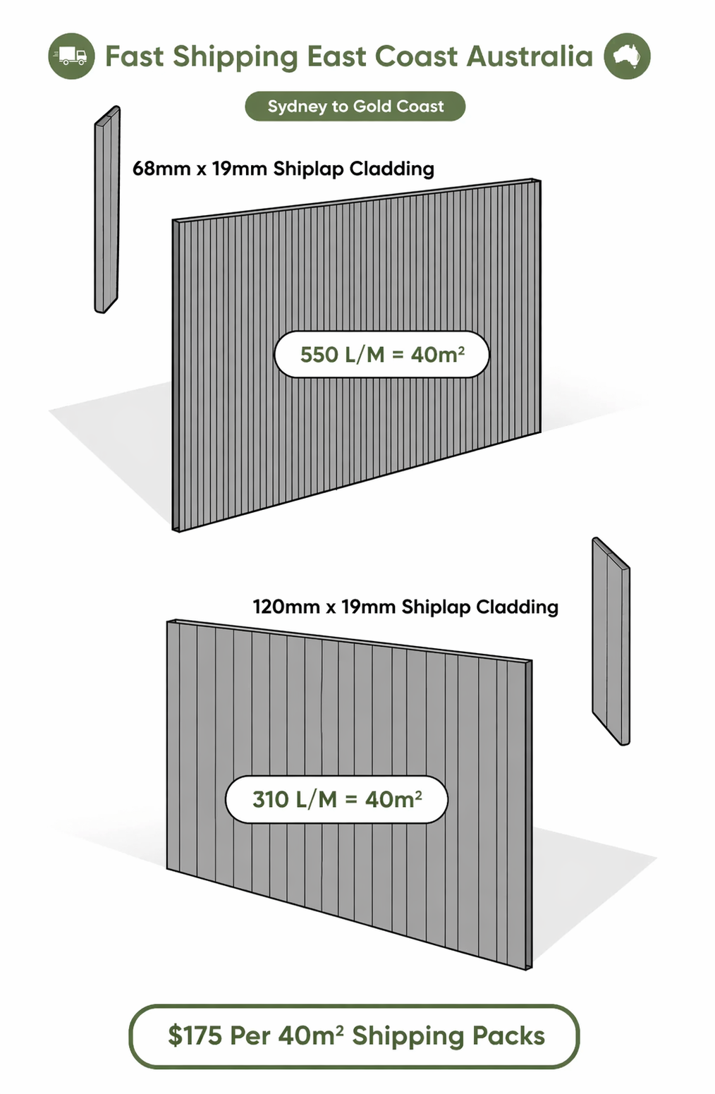 - Profiles: 68mm x 19mm or 120mm x 19mm shiplap